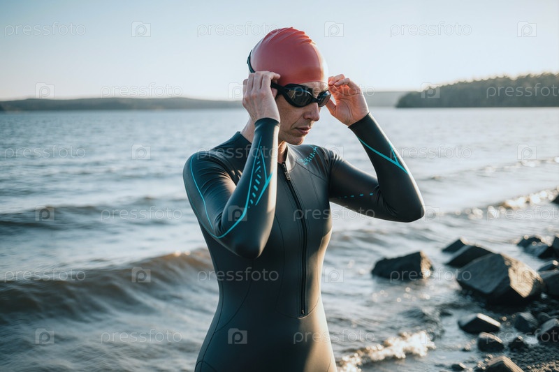 Взрослая женщина-триатлонщица регулирует очки перед открытым плаванием в воде
