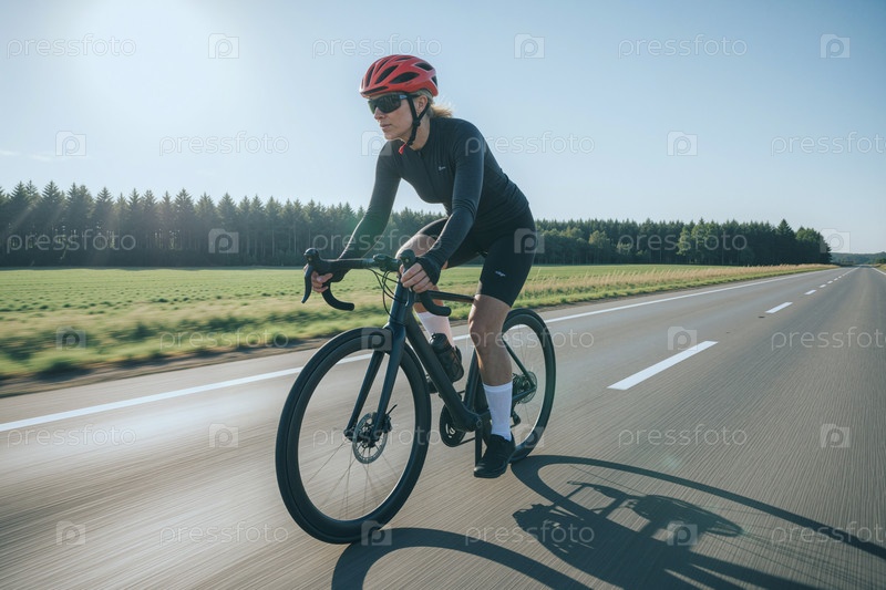 Взрослая женщина едет на велосипеде по открытой дороге для фитнеса и активного образа жизни