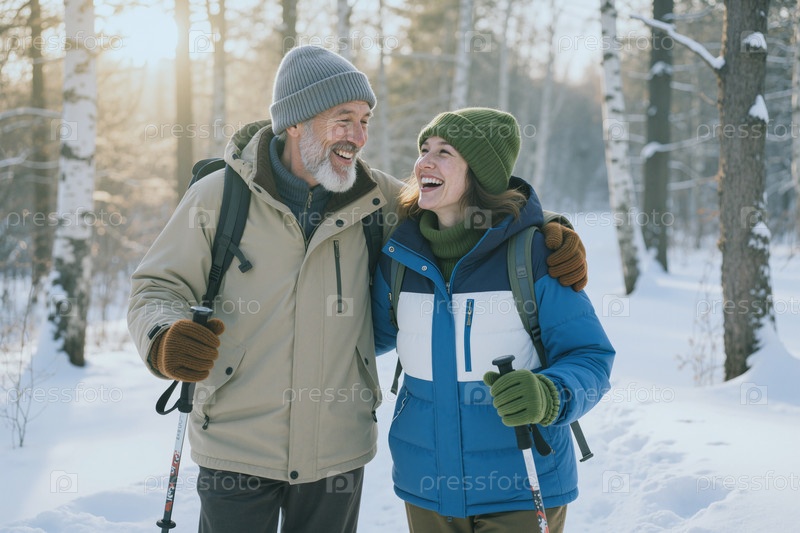 Мужчина-старший и взрослая женщина ходят в поход на зимнюю кампанию оздоровления
