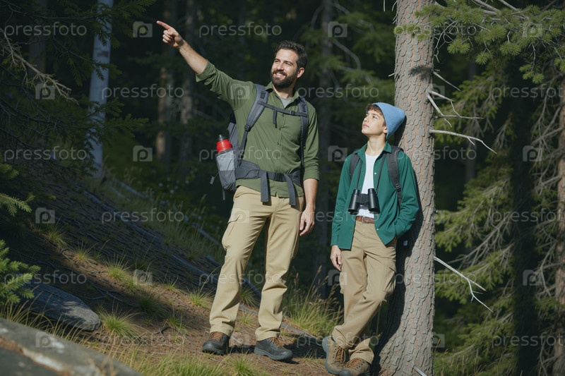 Взрослый мужчина направляет подросткового мальчика в поход во время лесного природового путешествия