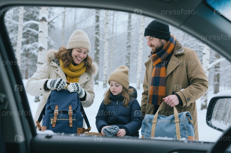 Подготовка семейного зимнего путешествия багаж рядом с автомобилем в снегу