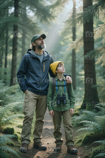 Мужчина средних лет и мальчик путешествуют по лесу для семейного приключения