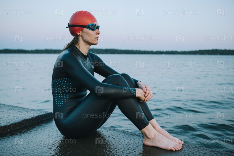 Взрослая женщина-триатлонка отдыхает у озера перед открытым плаванием