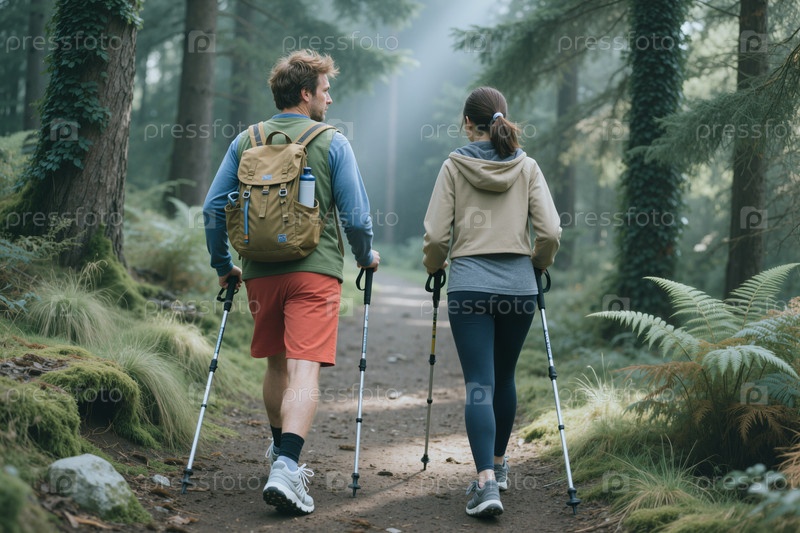 Мужчина и женщина взрослые ходят в поход с трекинговыми столбами для оздоровления