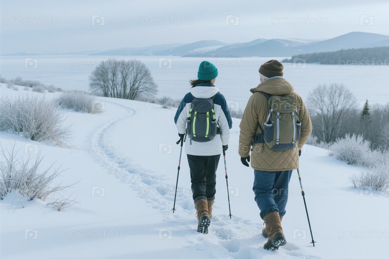 Взрослые пары ходят по снегу для зимнего оздоровительного путешествия