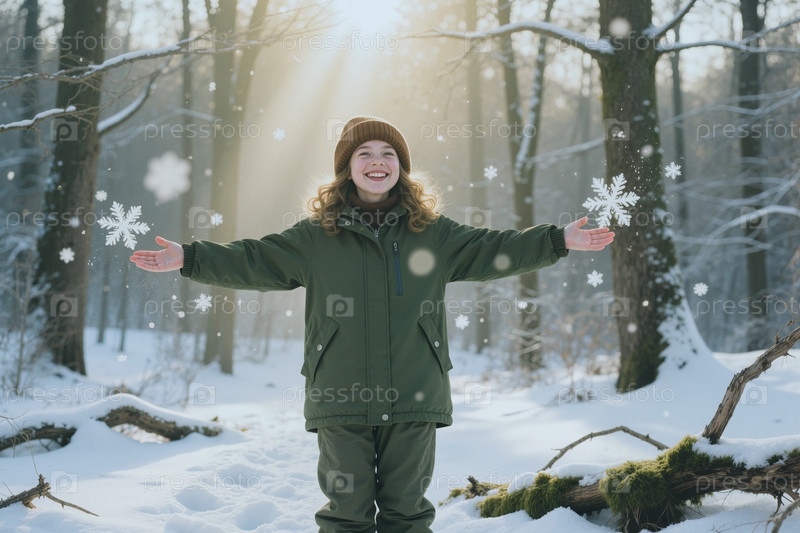 Портрет девочки-подростка, наслаждающейся зимними лесными каникулами