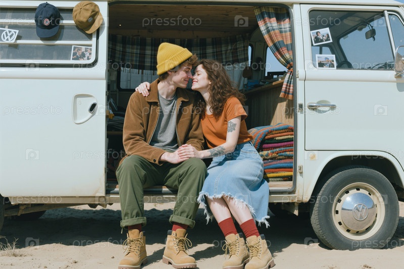 Взрослая пара обнимается в фургоне во время путешествия на дороге