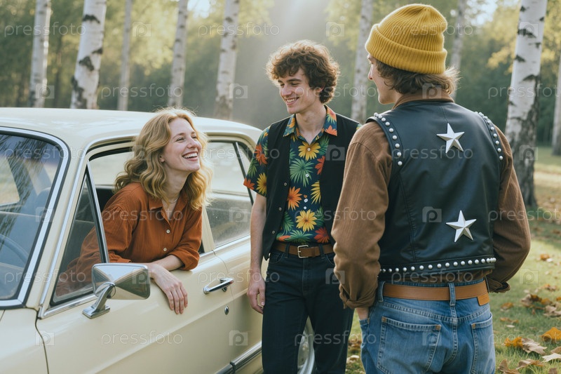 Взрослые друзья общаются на винтажном автомобиле во время отдыха