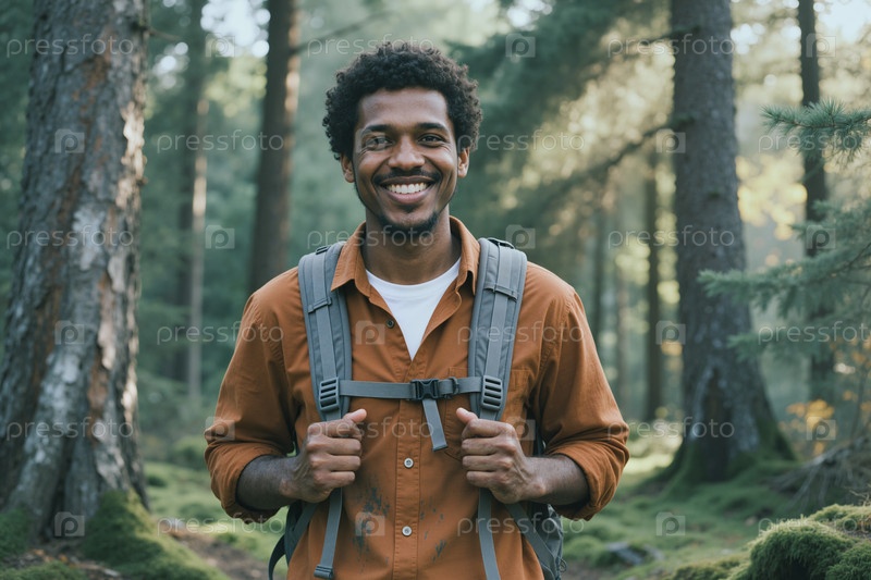 Портрет чернокожего мужчины, путешествующего по лесу для экологической кампании