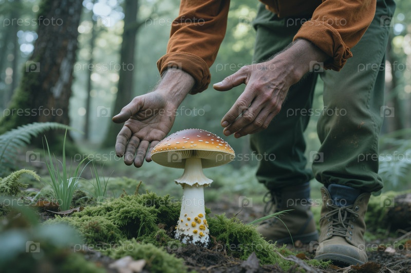 Взрослый мужчина изучает дикие грибы в лесу для образования о природе