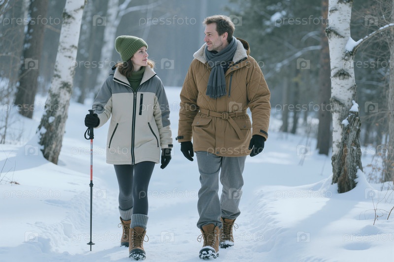 Взрослая пара ходит по зимней лесной тропе для здорового образа жизни