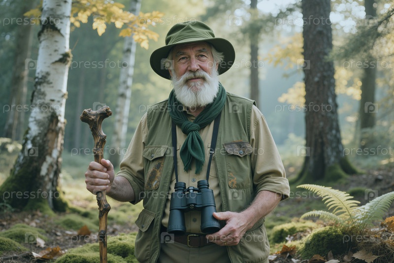 Портрет пожилого человека, ходящего в лесу для продвижения экотуризма