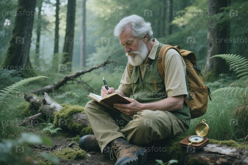 Старший человек записывает полевые заметки во время исследования экологии лесов