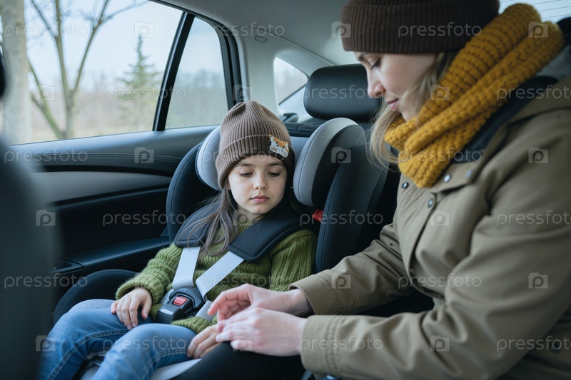 Мать, обеспечивающая ребенка в автокресле для безопасного семейного путешествия