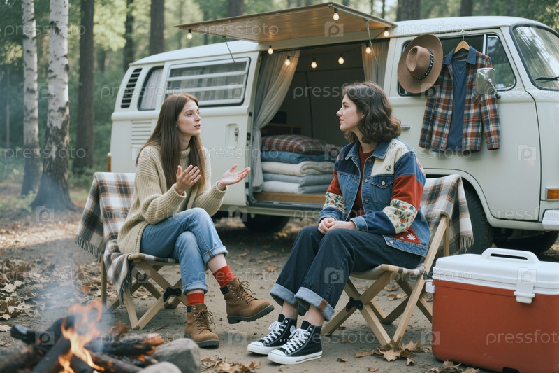 Взрослые женщины кемпинг и разговор в фургоне на выходные