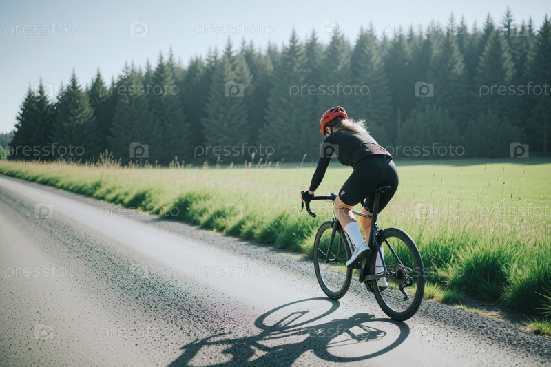 Взрослая женщина едет на велосипеде по сельской дороге для фитнеса и активного образа жизни