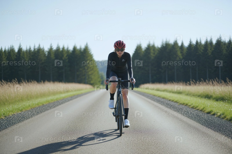 Взрослая женщина едет на велосипеде по сельской дороге для фитнес-тренинговой кампании