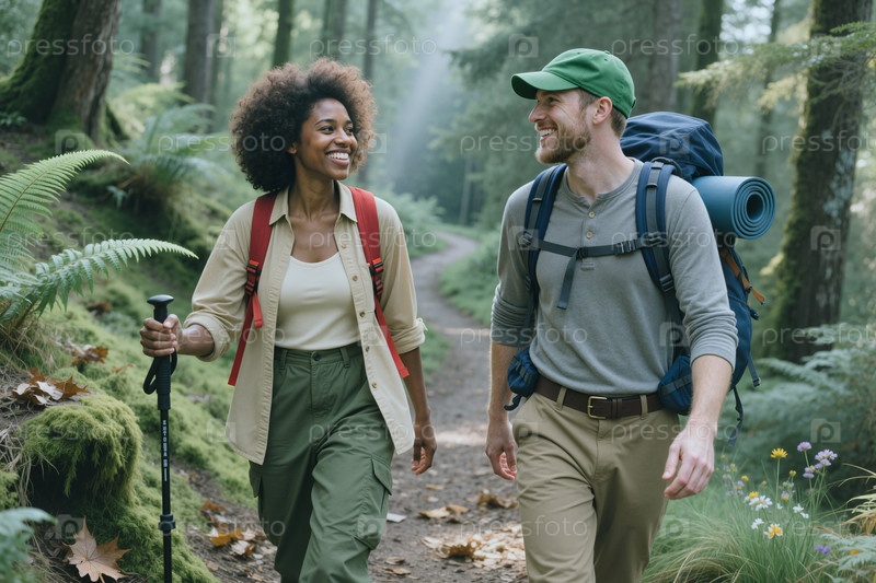 Черная женщина и мужчина ходят по лесной тропе для отдыха на свежем воздухе