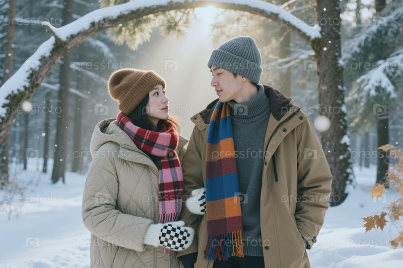 Азиатская взрослая пара гуляет в снежном парке для кампании зимнего путешествия
