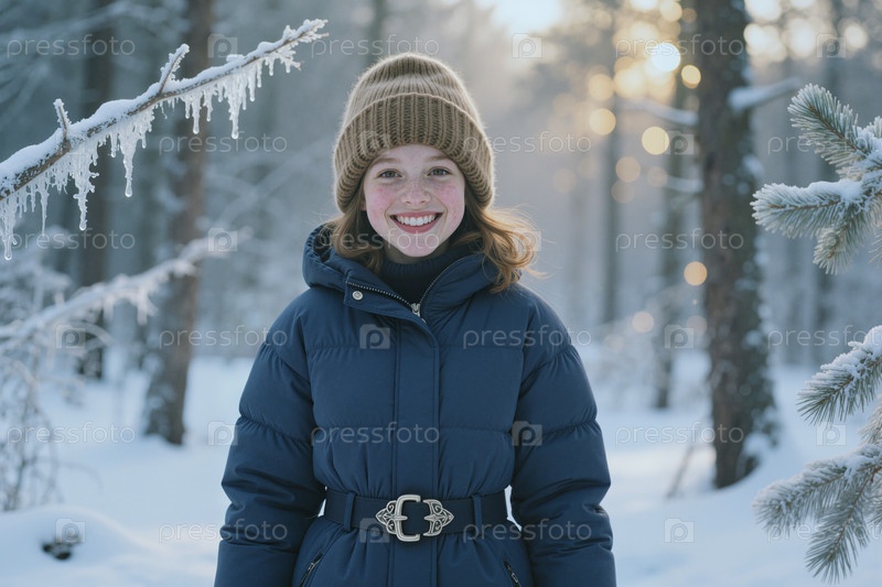Портрет девочки-подростка, улыбающейся в зимнем лесу для сезонной кампании