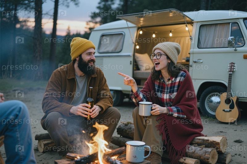 Взрослые друзья отдыхают у костра во время кемпера Van Getaway