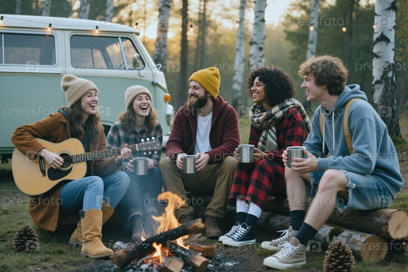 Разнообразные друзья кемпинг и пение с помощью костра для путешествия образ жизни