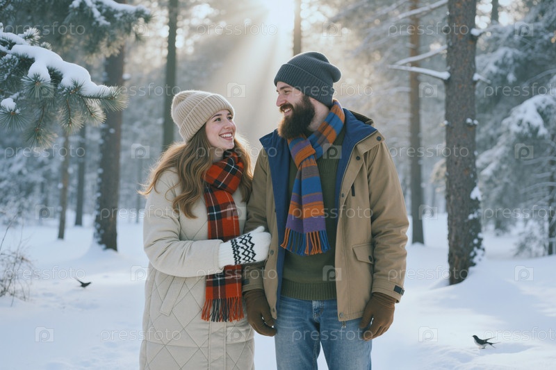 Взрослая пара ходит по снежным лесам для зимней туристической кампании