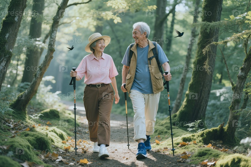 Пожилая азиатская пара ходит в лес для активного пенсионного оздоровления
