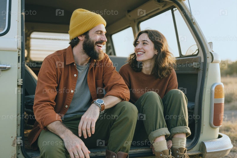 Взрослая пара сидит в фургоне и улыбается во время дорожной поездки