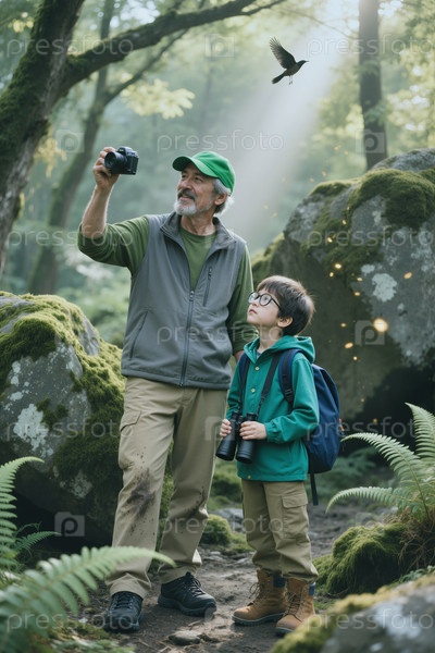 Старший мужчина и мальчик наблюдают за птицами в лесу для семейного путешествия