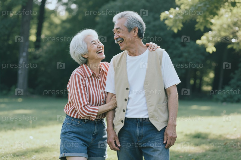 Азиатская пара смеется вместе в парке для старшего пенсионного образа жизни