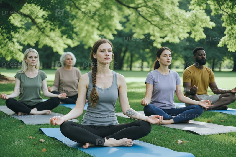 Различные взрослые медитируют в парке для оздоровления и осознанности