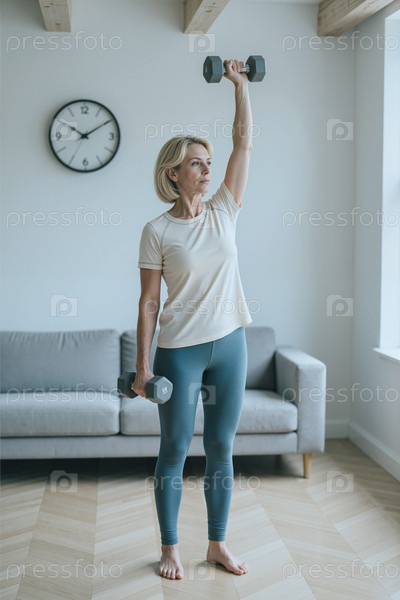 Женщина среднего возраста поднимает гантели во время домашней фитнес-тренировки