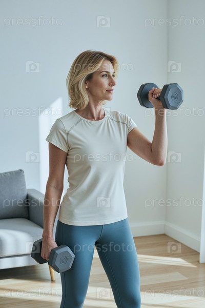 Женщина среднего возраста поднимает гантели для домашней фитнес-рутины