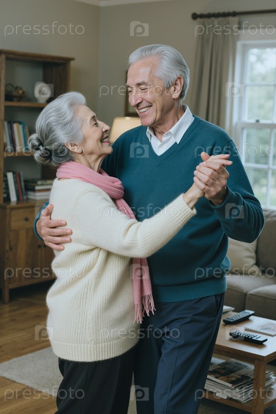 Старшая пара танцует дома, празднуя активный образ жизни пенсионеров