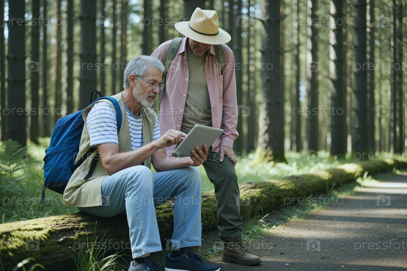 Мужчины старшего возраста ходят в поход и используют планшет для навигации лесными тропами