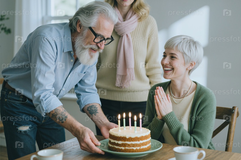 Старший мужчина преподносит взрослой женщине торт на день рождения во время семейного праздника