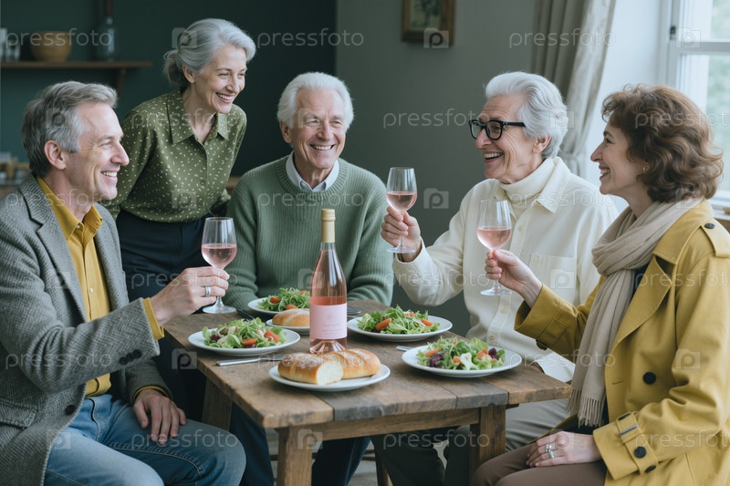 Старшие друзья делятся обедом и вином для пенсионного образа жизни