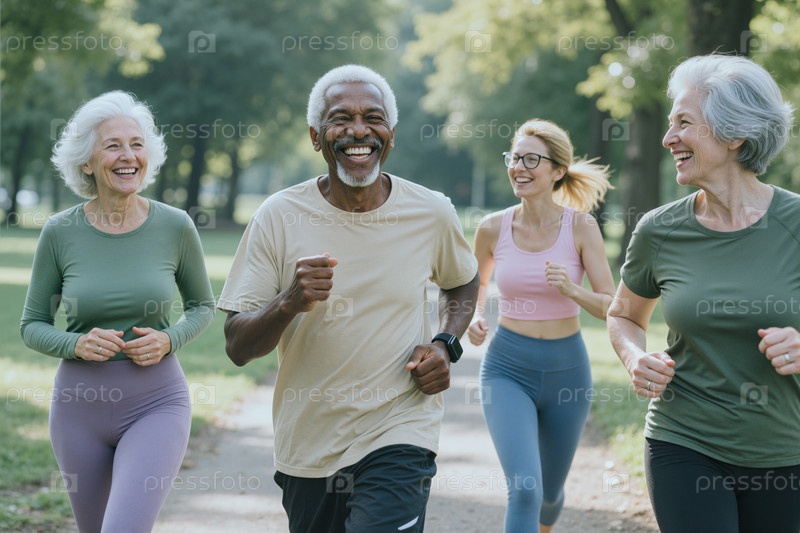 Разнообразные пожилые люди и взрослая женщина бегают за здоровым активным образом жизни