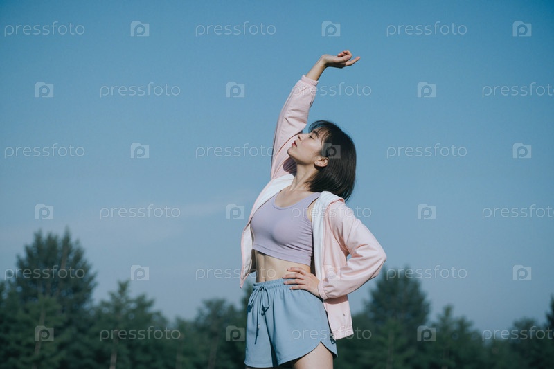 Взрослая азиатская женщина растягивается на улице для фитнес-кампании Wellness
