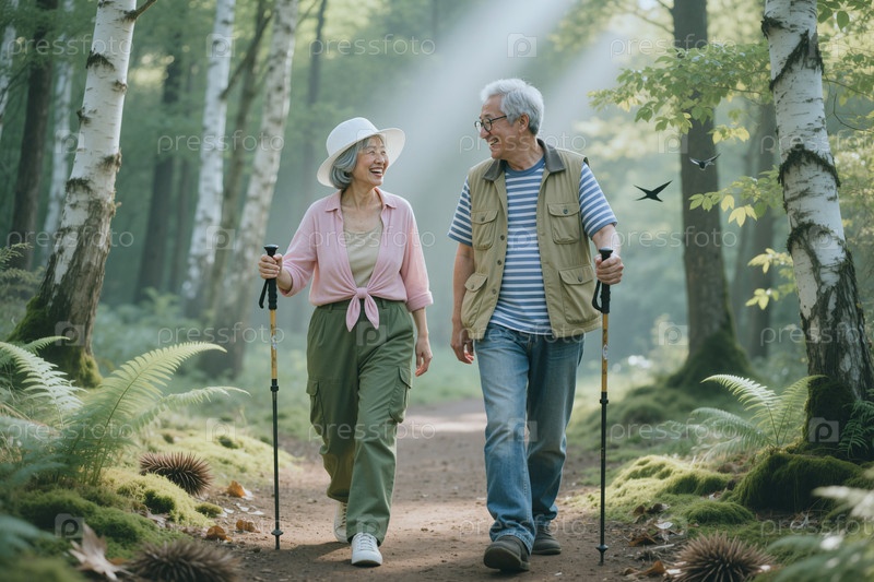Старшая пара ходит в лес для активного пенсионного образа жизни