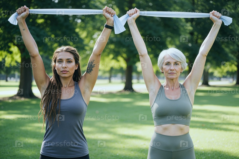 Портрет взрослой женщины и пожилой женщины, растягивающейся в парке