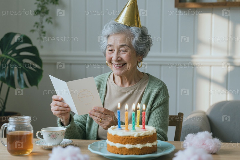 Старшая женщина читает открытку на день рождения во время домашнего праздника