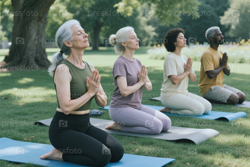Разнообразные взрослые медитируют во время занятий на открытом воздухе йоги и оздоровления