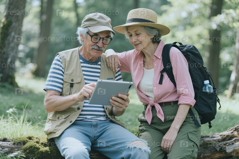 Старшая пара использует планшет во время похода для планирования путешествий