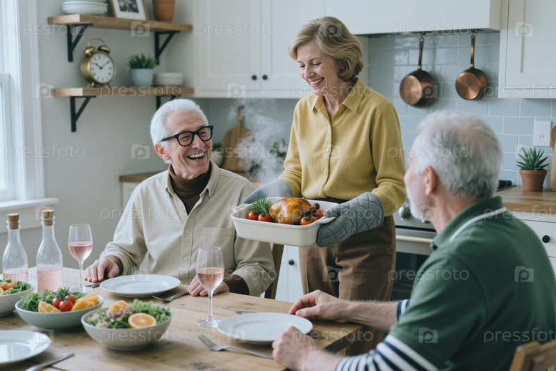 Старшая женщина, подающая обжаренный ужин друзьям во время домашнего сбора