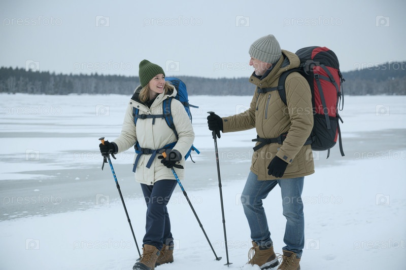 Взрослая женщина и пожилой мужчина зимнее походы для активного путешествия