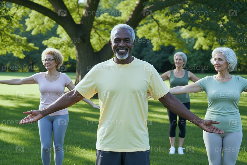 Портрет старшего чернокожего мужчины, ведущего занятие фитнесом на открытом воздухе в парке