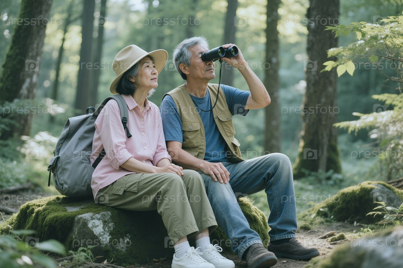 Старшая азиатская пара наблюдает за птицами во время лесного экотуризма
