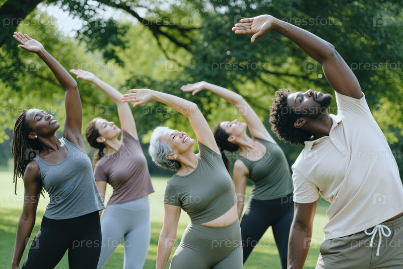 Различные взрослые растягиваются во время занятий фитнесом на открытом воздухе